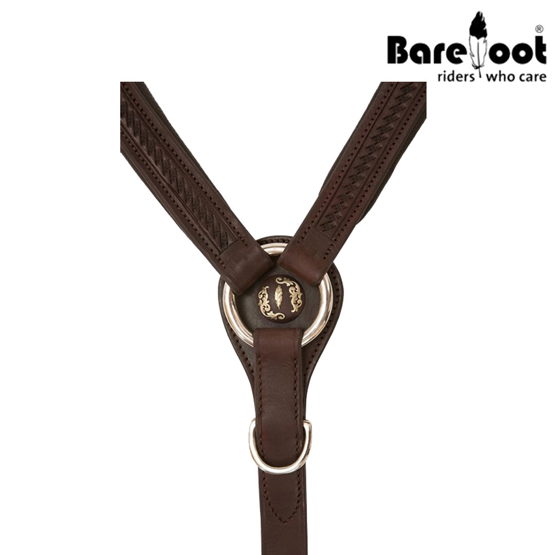 Este pechopetral está hecho de cuero de alta calidad, suave y flexible. El pechopetral marrón muestra una costura notable.