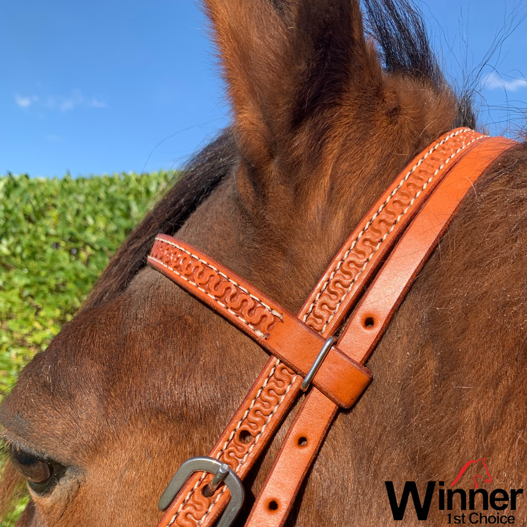 Piel marcada con detalle que marca la diferencia, haz que tu caballo lleve una cabezada especial.