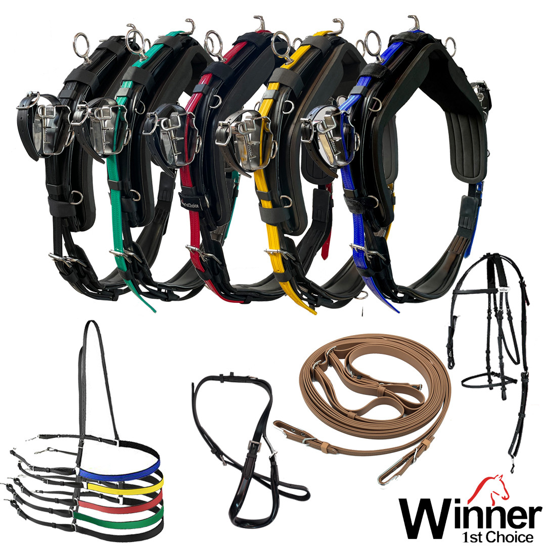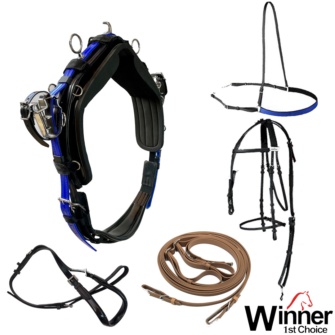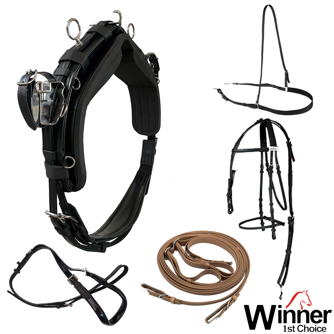 Viene incluido guarnición, enganche "clic", baticola, cabezadas con engallador, petral, riendas y cojín cruz libre.