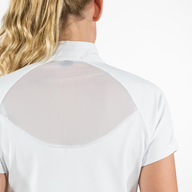 Una hermosa camisa técnica con una malla transpirable en el pecho. El clásico collar de tela tejida blanca tiene una cremallera en el lateral del hombro.